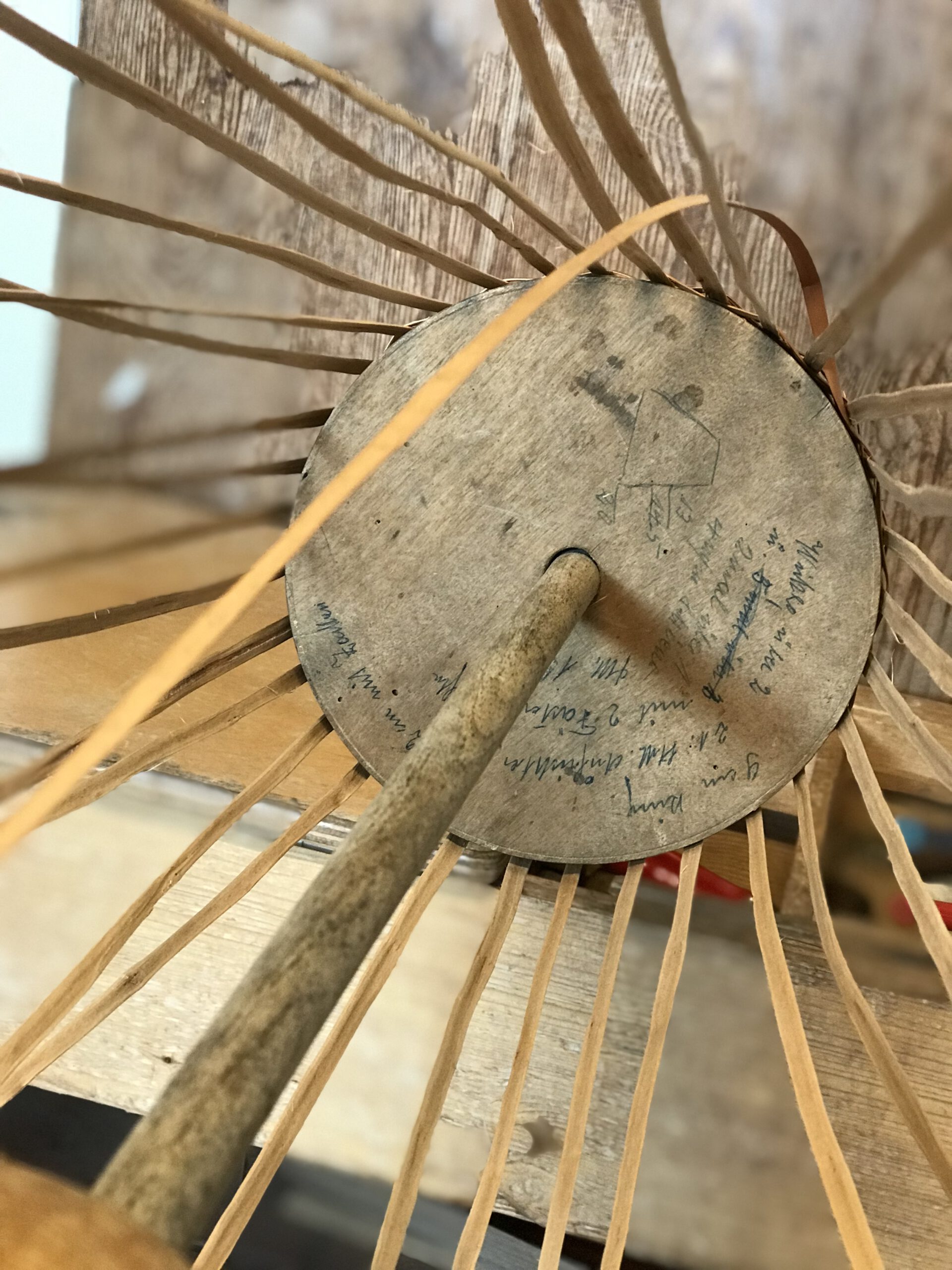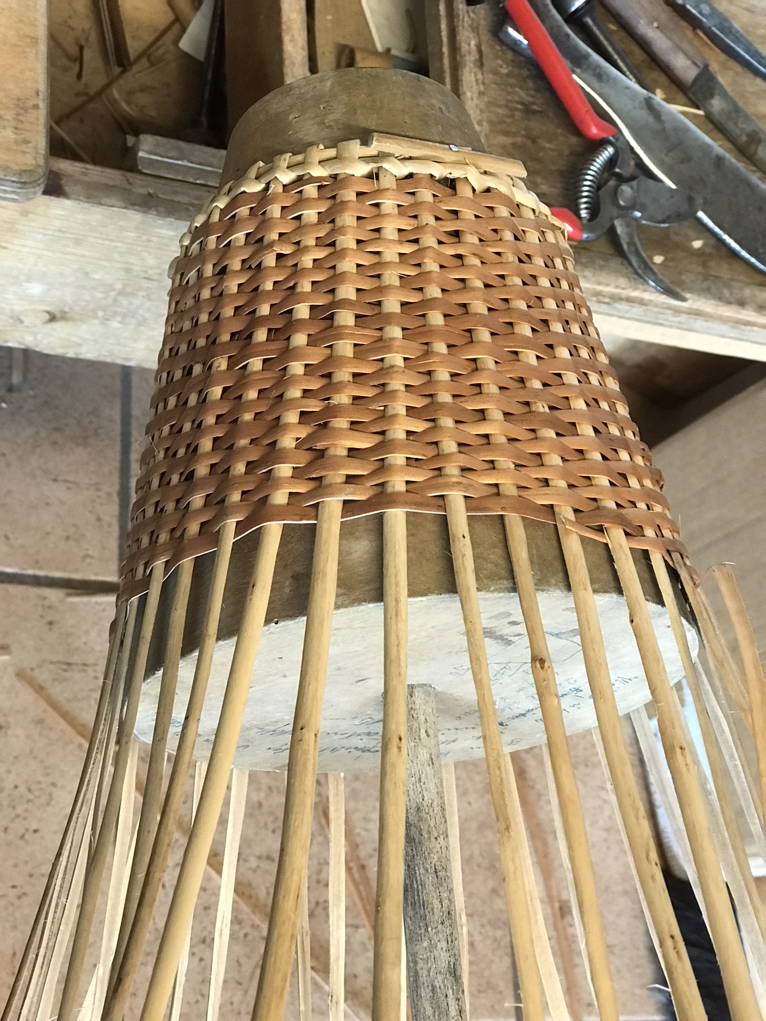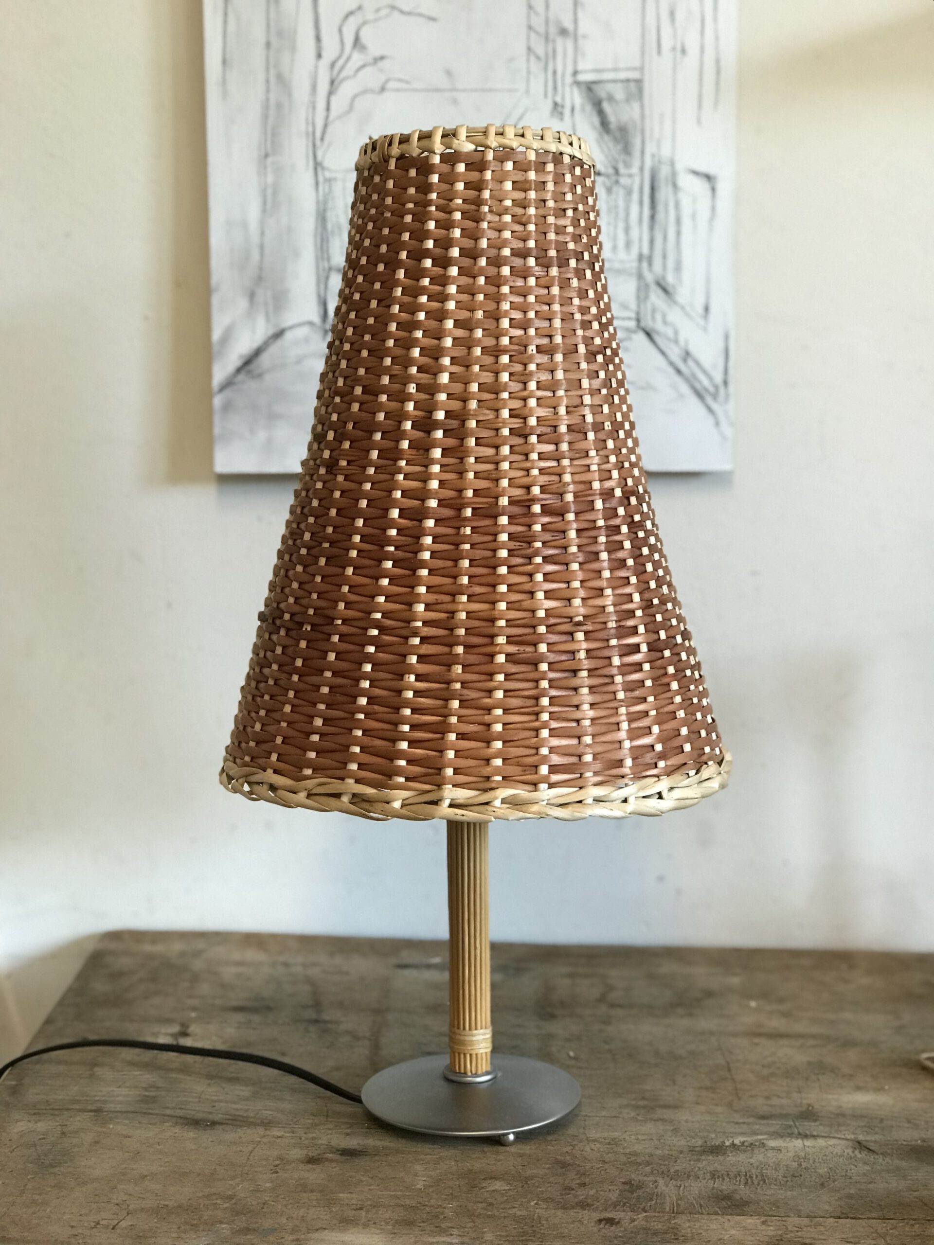 Aus alten Familienbeständen: Weidenschienen, auf antiken Holzformen zu Lampenschirmen verflochten, kombiniert mit upgecycelten Lampenteilen.